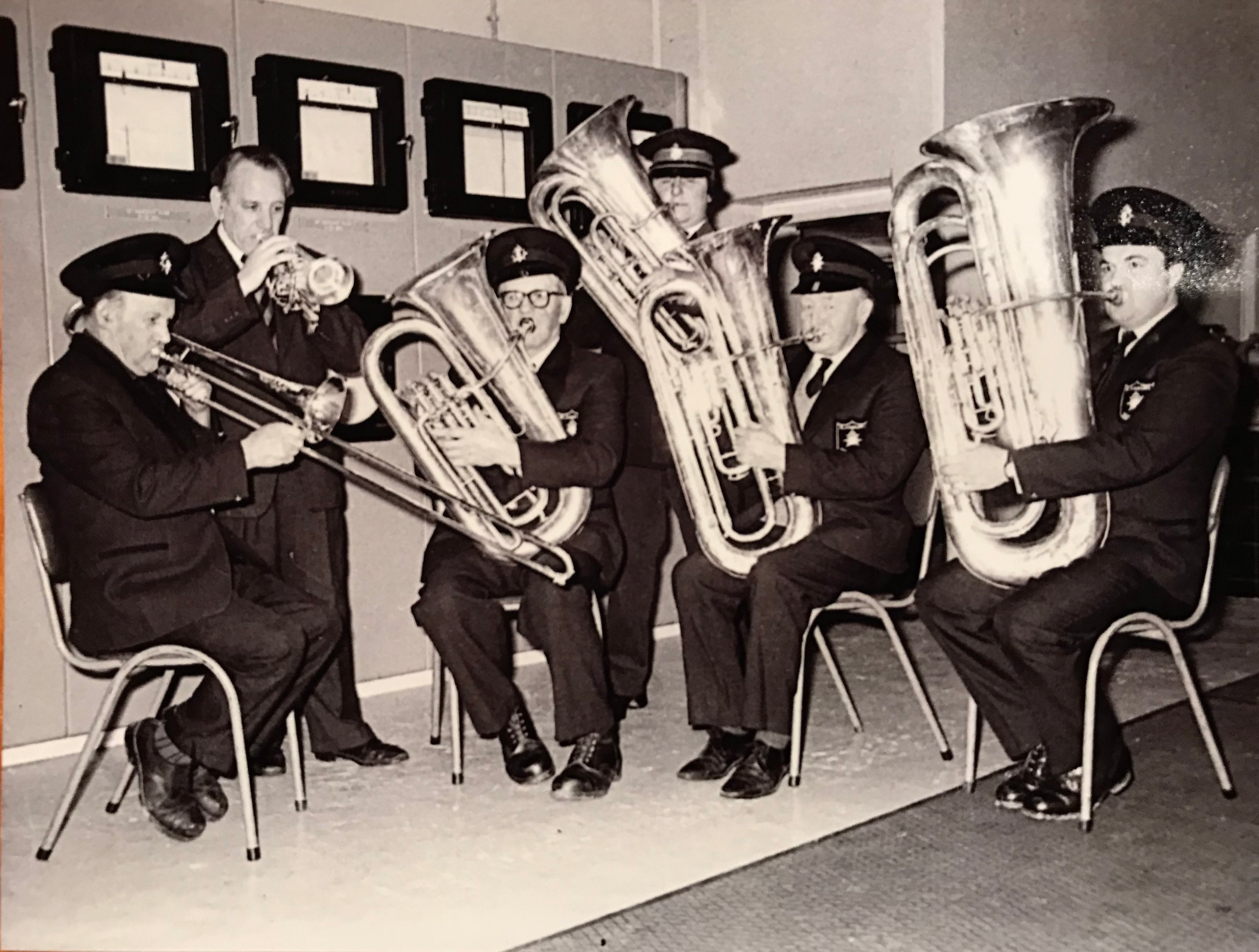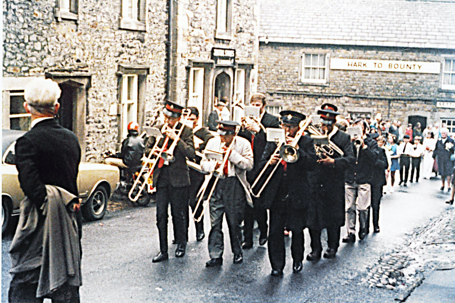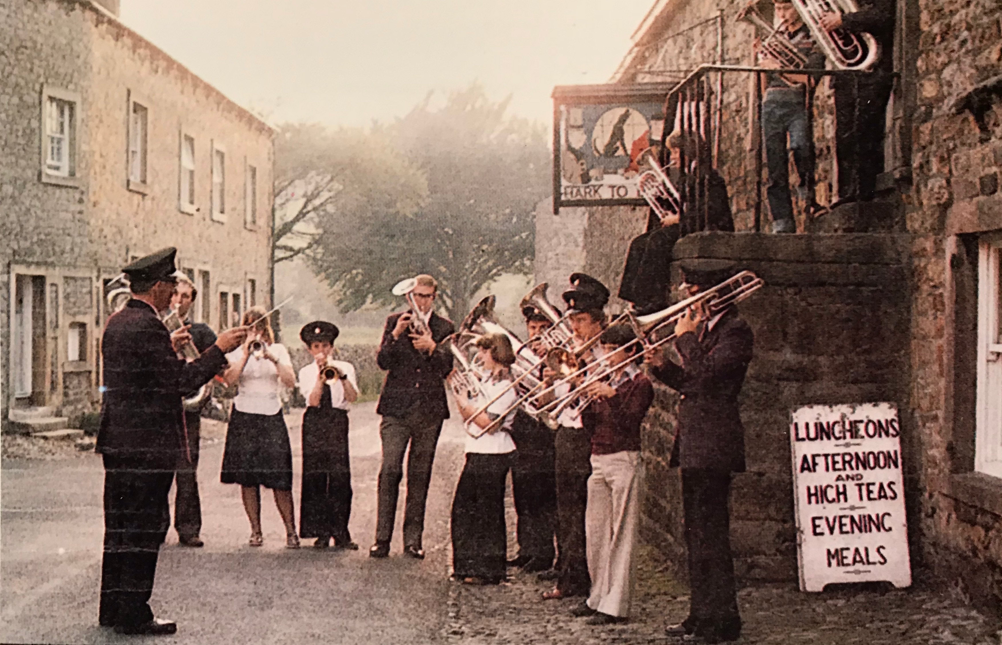 Three Cowkings on trombones in Slaidburn. 1971.