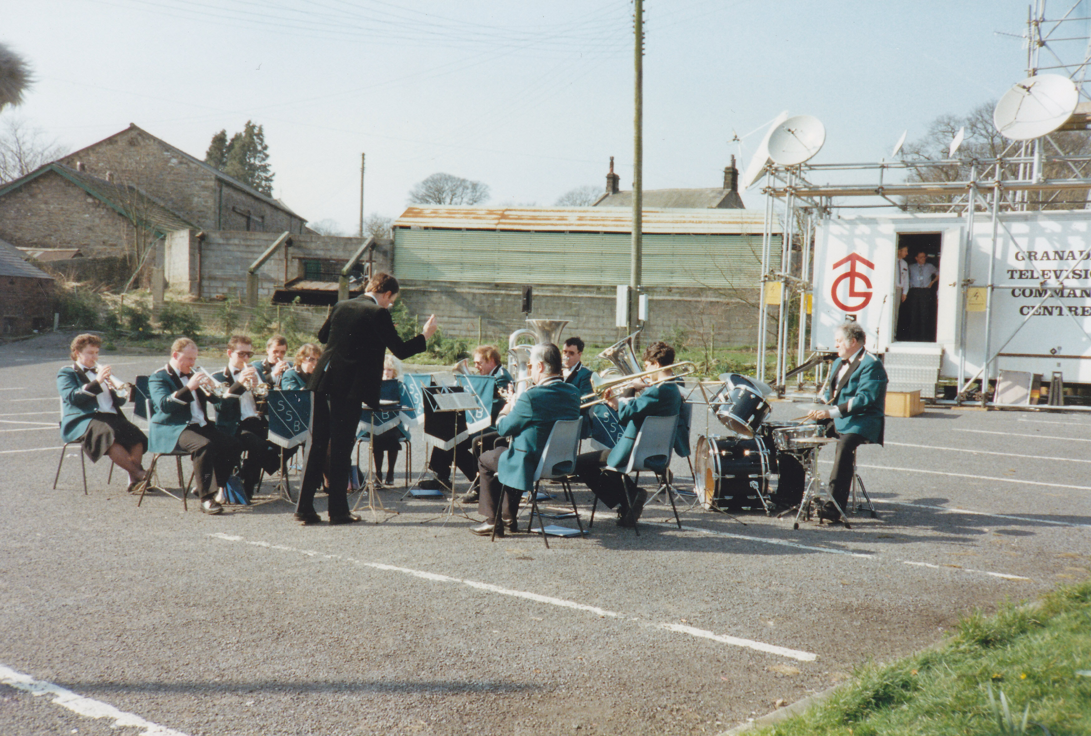Playing in the Higher Buck car park, Waddington for ‘Granada Reports’. 1994.