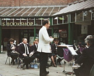 Carol playing in the Market Place, Clitheroe. 1995