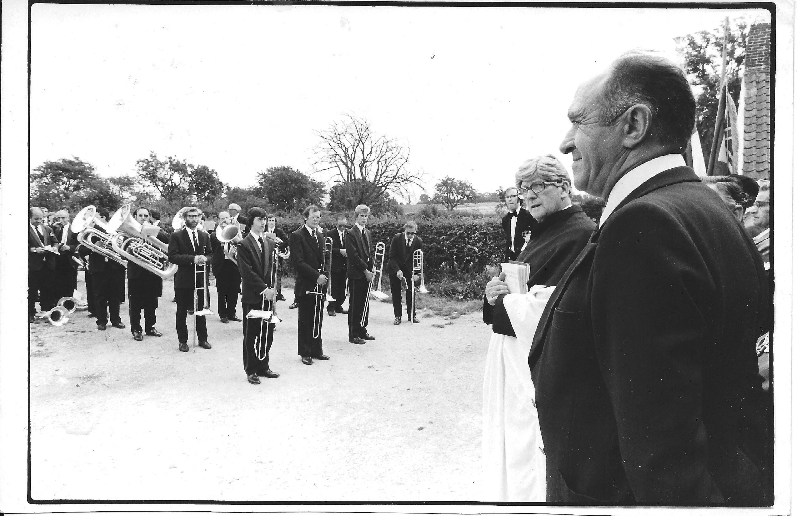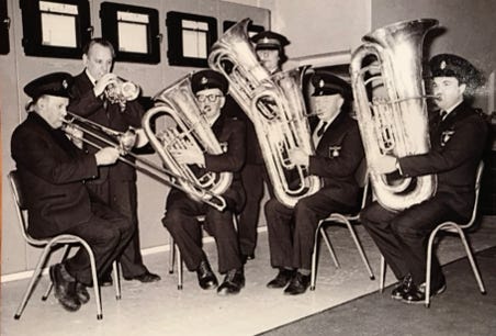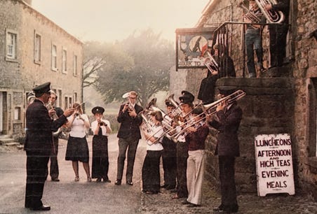Three Cowkings on trombones in Slaidburn. 1971.