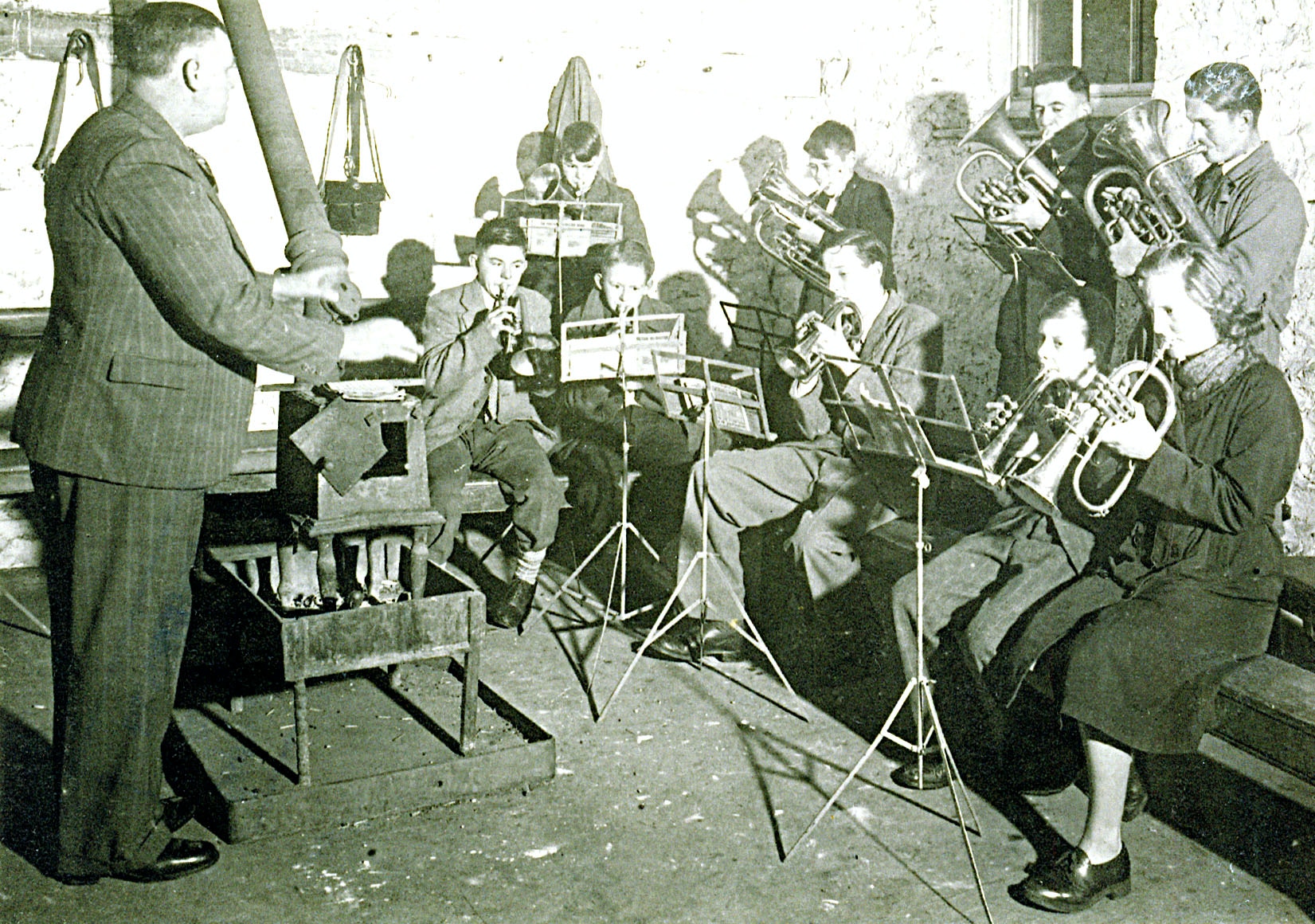 Band practice, under the direction of Bill Oddie. c1950.