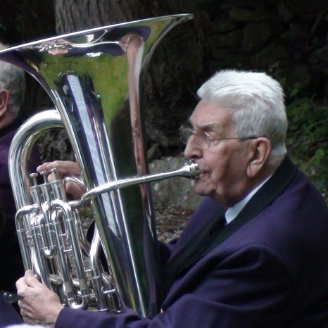 He and other villagers found the bandroom covered in cobwebs and the instruments tarnished black! They set to work cleaning things up, using pan scrubs and Brillo pads on the instruments to get them playable! He remained a loyal member of the band for nearly 40 years until eyesight problems forced him to retire.